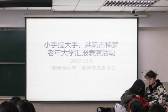 (摄/郑甜 罗娜 文/韩思洁 范期明为弘扬志愿者“奉献、有爱、互助、进步”的精神,同时向老人们传递关爱与温暖,12月8日上午九时三十分,36365官网阳光号列车全体成员在14教南小广场开展了主题为“小手拉大手,共筑古稀梦”的汇报表演活动。志愿者、老人们共同参与。