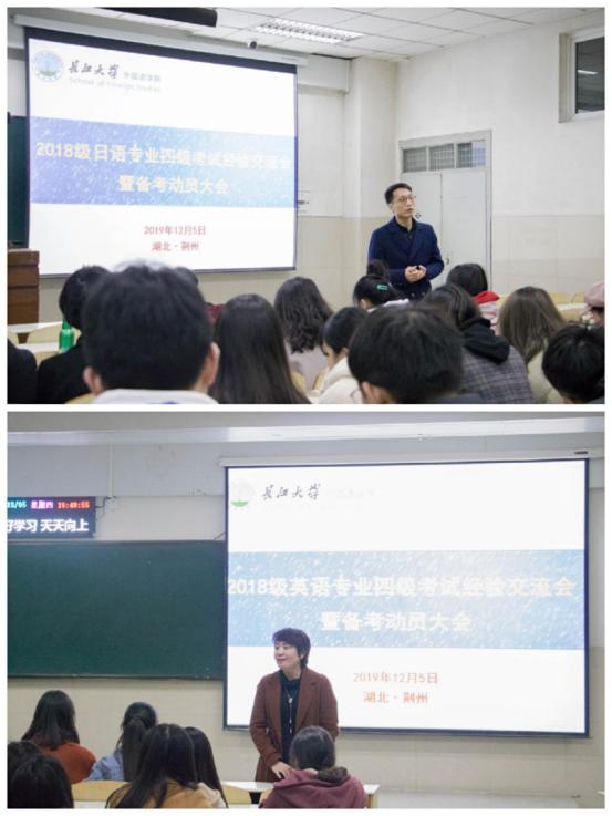 在英语专四分享会上,两位优秀学生代表罗理非和罗明慧同学分别从题型分析、英语词汇、英语听力及阅读部分的考点和难点及考试的注意事项等方面进行了介绍。分享了自己的备考经验和感受,并给即将进入备考阶段的18级全体学生在英语四级考试怎样学习等问题上给出了各自的意见。罗理非同学分享了她的个人看法,她表示态度是否端正对专四能否通过很关键,每个同学都应该沉下心来好好准备复习,单词是基础,每天都应该有计划的背记单词,还有要认真研究专四相关的真题,慢慢进入考试状态;而罗明慧同学则主要以外刊为着眼点,分享了自己再看外刊方面的心得体会以及外刊对备考专四的意义。在日语专四分享会上,大三学长向同学们介绍了日语专业四级的经验知识,他着重强调要注重考前备考,在时间紧任务重的情况下要注重基础把握好新编日语的课程。“见贤思齐焉,见不贤而内自省也”吸取前者的教训,并将前者的长处发扬光大。