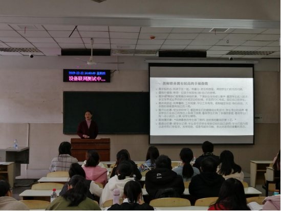 邱煜老师用歌曲《长大后我就成了你》作为讲座导入,谈到教师职业拥有较高的幸福指数。接着从“十九大报告”中,强调建设教育强国是中华民族传统复兴的基础工程,要加快教育现代化,办人民满意的教育,让每个孩子享有公平而有质量的教育,必须把教育事业放在优先位置,讲述了我国教育发展的实力与战略。接着讲到新时代的教师素质应该是多面的整合体,具备正确的价值观,良好的个人素质,深厚的专业素养和高效的教学能力。在教育价值观与职业态度方面,邱煜老师谈到,我们首先应该尊重学生,接纳学生。没有自尊的学生是最难教的,因此教师尊重学生是保护、唤醒学生自尊的必要条件。