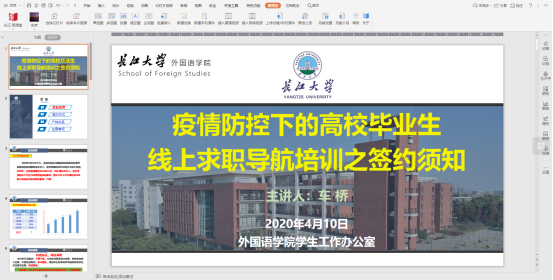 随着2020毕业季的临近,疫情期下学生面临的新问题和新挑战,4月10晚上,36365线路检测中心就业指导老师车桥向毕业生们开展签约须知线上指导讲座。讲座通过长江雨课堂平台开展,学院2016级所有本科生参加。