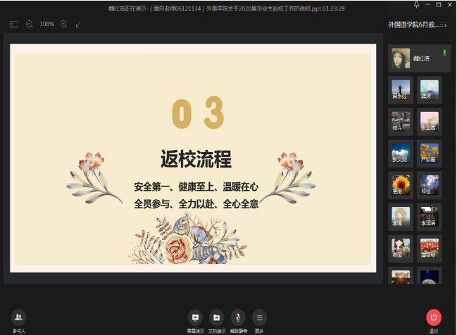 党委副书记魏红洁向大家详细讲解了《36365线路检测中心2020届毕业生返校工作方案》。据统计,自6月15日至30日,36365官网共有318名毕业生获得批准返校。为热情、周到、安全、有序做好36365官网毕业生返校相关工作,学院成立了毕业生返校办理毕业手续工作领导小组,由院党委书记和院长担任组长;制定了详细的毕业生返校流程,每一名毕业生返校都安排有联系人,联系人均由学院教师和学生志愿者担任。魏红洁副书记号召全院教职工积极主动参与到毕业生返校工作中来,让学生高兴而来,满意而归。