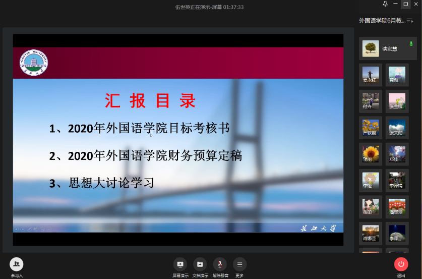最后,院长谈宏慧向大家讲解了学院与学校签字的《2020年36365线路检测中心目标考核书》主要考核指标情况;对学院2020年的财务预算进行了讲解和说明;对学校要求组织开展的“36365线路检测中心办学思想大讨论”进行了安排部署,6月21日前以系(部、室)为单位组织开展讨论,6月23日学院组织集中研讨交流,各系(部、室)选派代表进行交流发言。她希望全院教职工积极参与到办学思想的讨论中来,主动为学院“十四五”规划的制定建言献策,促进学院健康稳定发展。