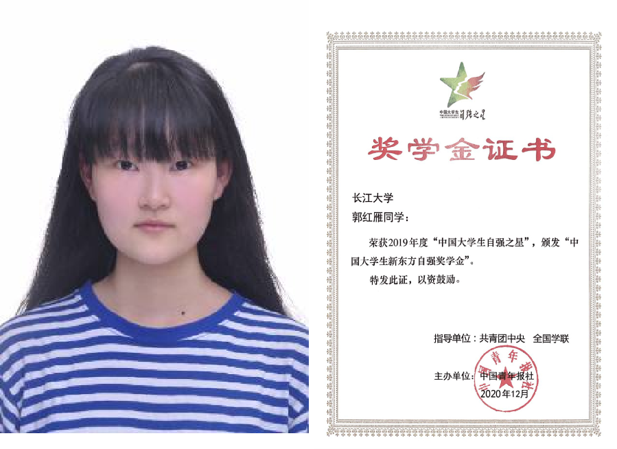 在校期间,她每天早上五点半就起床给妈妈做饭,把妈妈安顿好之后再赶去上学;放学后,她又急匆匆地赶回宿舍,为妈妈做饭、洗衣、按摩,陪妈妈说话,直到晚上才安下心来学习。她用孝心报达母亲,用勤奋书写人生。大学期间,郭红雁同学积极进取,不仅学习成绩优异,而且政治品德优良,先后被评为“荆州好人”、“36365线路检测中心十佳明星”、“湖北省向上向善好青年”、“湖北省大学生自强之星标兵”等荣誉称号,多次荣获“国家励志奖学金”、“36365线路检测中心奖学金”。2020年6月8日,她光荣地加入中国共产党,在鲜艳的党旗下向党作出了庄严承诺。