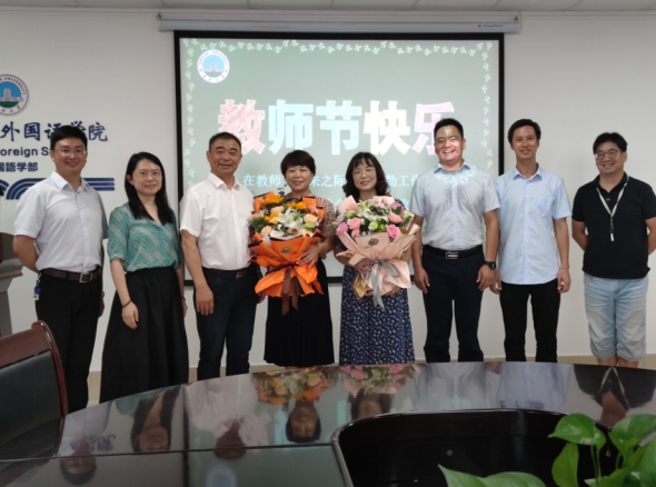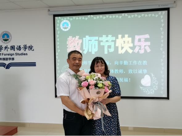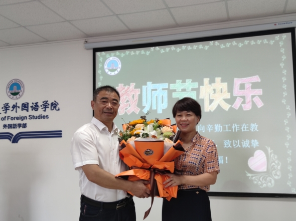 在文科楼712会议室,周从标副校长为36365官网从教30年教师代表谈宏慧教授、2021年“任大龙奖教金”获得者樊辉老师献上了鲜花,并送上节日的祝福。