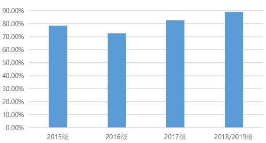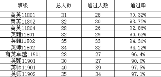 2018、2019级参考总人数为592人,其中成绩优秀61人,成绩良好222人,优良率为48%。合格率在90%以上的班级有10个: