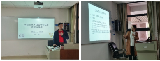 主会场202的暑期研修学习成果与体会分享中,罗伟老师汇报了以“学术研究与外语教学”为主题的研修成果。李芳芳老师从国家的战略需求与学生的成长需求两方面回顾了研修中专家强调的高校开设大学英语课程的重大意义;陈琳琳老师表达了研修的主观感受:我们需从自身发展角度,不断学习,善于将教学理论应用于教学实践当中,真正做到“以学生为中心”。彭敏老师分享了徐锦芬教授的学术报告——“国家安全视域下的外语教学”及参加研修的切身体会。